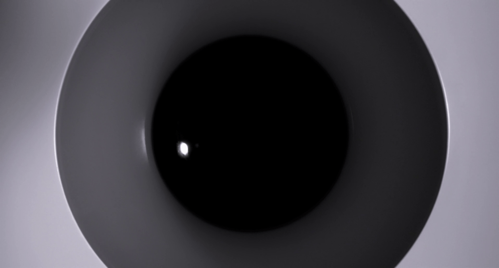 C’est la forme circulaire qui s’empare de l’extrait, sans en tirer une finalité pour autant. L’oeil final donc, mais avant lui le petit point blanc qui ouvre le film, l’éclat qui en jaillit et les plateformes qui permettent à l’oeil alien de s’assembler. Autre circulation de cette introduction, les mots, sons et syllabes répétés plusieurs fois par le personnage, une boucle de prononciation en off : il répète le son ou le mot jusqu’à le maitriser 1 avant d’en passer à un autre. Autre boucle sonore, la musique de Mica Levi qui, par intermittence ceci dit, reproduit une même rythmique étrange dont je n’arrive pas à identifier l’instrument (probablement un son d’ordinateur, donc quelque chose d’aussi factice que l’enveloppe corporelle endossée par l’alien). La reproduction de la forme circulaire de l’oeil à travers d’autres éléments de cette introduction (y compris sonores) conforte l’idée d’un oeil dont Glazer questionne la propre genèse formelle : la forme qui ressemblera à une autre forme induit forcément des formes similaires avant elle. Nous sommes clairement sous l’oeil alien, lui-même sous l’oeil humain.